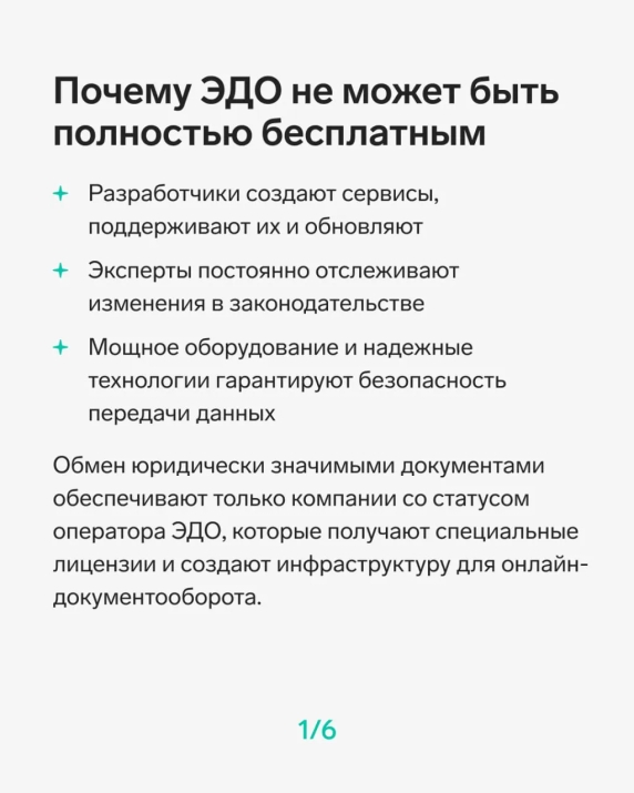 Отправить электронный документ дешевле, чем бумажный. С электронным документооборотом (ЭДО) компании экономят на бумаге, заправке картриджей, конвертах, услугах доставки и хранении. Отправка документа через сервис ЭДО в разы дешевле, чем доставка почтой или курьером. А может ли ЭДО быть полностью бесплатным? Эксперты Контур.Диадока отвечают на этот вопрос и поясняют, за какие возможности сервиса не надо платить. Подробности в карточках и статье ⚡️