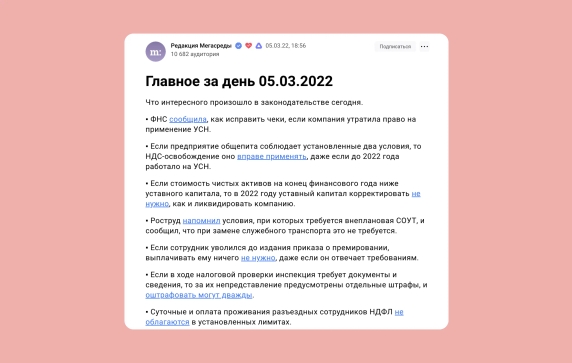 Наша аудитория ценит время и предпочитает узнавать об изменениях быстро. Иногда загрузка такая, что времени на просмотр новостей попросту не хватает. Чтобы наши читатели не пропустили самое важное, мы ежедневно собираем самые интересные новости в одном посте. Публикуйте интересный для аудитории контент — и ваши посты появятся в ежедневной подборке, что позволит получить новых читателей и дополнительно продвинуть себя в качестве автора.