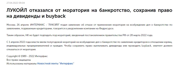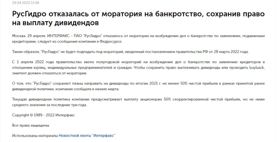 Тысячи компаний по всей стране уже отказались от действия моратория. Даже такие устойчивые предприятия страны, как к примеру Лукойл и РусГидро, публикуют в Федресурс заявления и возвращают себе право на распределение прибыли и выплату дивидендов. Ниже прикрепим скриншоты соответствующих новостей с сайта реестра.