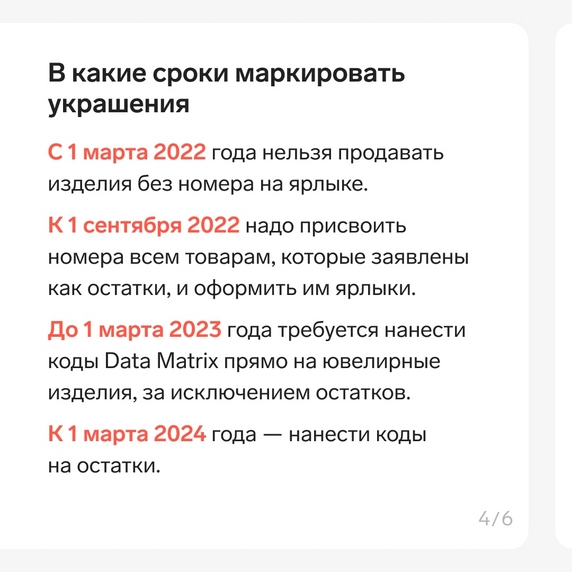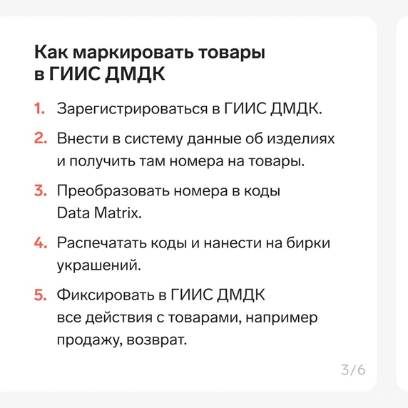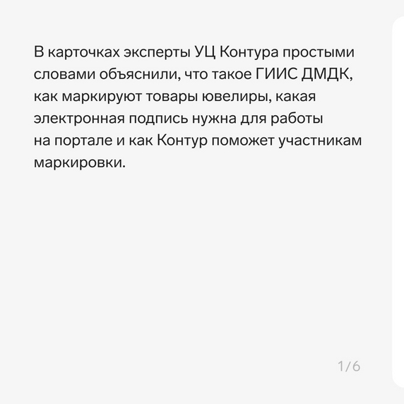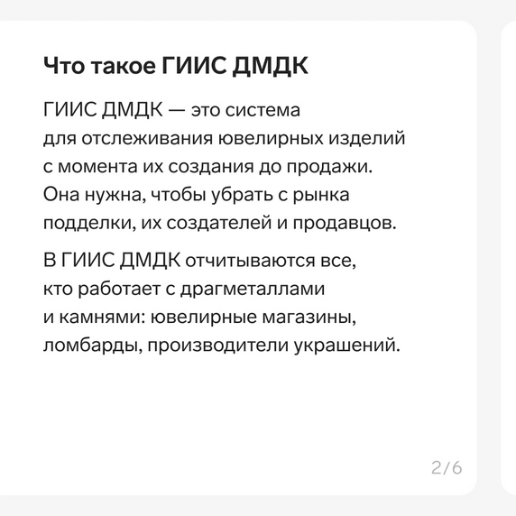 🔗 Чуть больше месяца осталось у ювелиров, чтобы соблюсти обязательный этап маркировки украшений: к 1 сентября 2022 года оформить на все товары ярлыки с уникальными номерами изделий. Их участники маркировки получают в Государственной информационной системе драгметаллов, камней и изделий из них (ГИИС ДМДК). На карточках — краткая инструкция по ГИИС ДМДК от экспертов Удостоверяющего центра Контура.