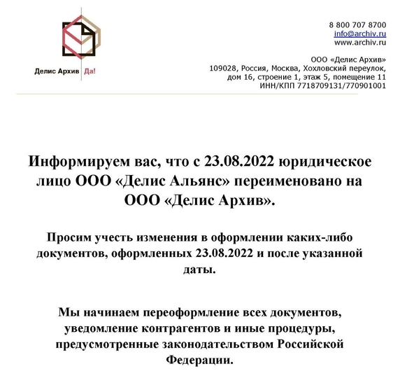 23 августа 2022 года согласно данным выписки из ЕГРЮЛ, компания ООО "Делис Альянс" была переименована в ООО "Делис Архив".