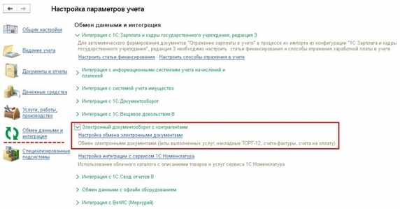 В форме Настройка параметров учета на закладке Обмен данными и интеграция в группе команд Электронный документооборот с контрагентами необходимо вызвать команду Настройка обмена электронными документами.
