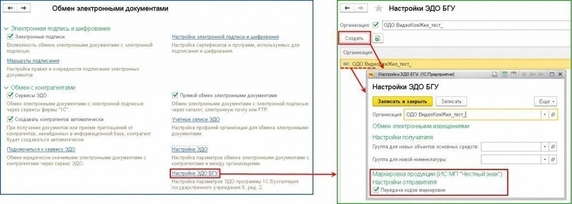 Для использования этой возможности необходимо открыть форму настроек Обмен электронными документами, в группе Обмен с контрагентами, перейти по ссылке Настройки ЭДО БГУ и в настройке ЭДО организации включить флажок Передача кодов маркировки.