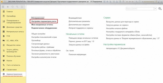 Для включения возможности электронного обмена с контрагентами следует перейти в раздел Администрирование и открыть форму Настройка параметров учета.
