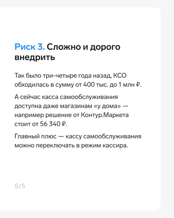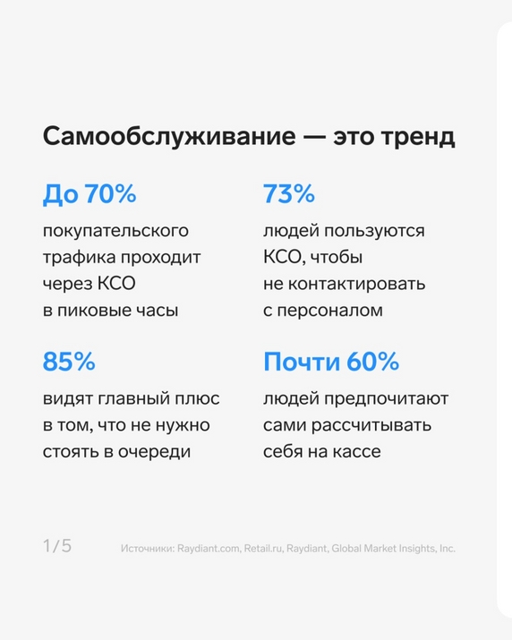 В магазинах не просто так появляются терминалы, на которых покупатель может рассчитать себя сам. Международная практика доказала, что это выгодно. Тренд уже освоили крупные ретейлеры, теперь он доступен и небольшим магазинам. Подробности эксперты рассказали в статье. А самые важные плюсы и минусы мы собрали в карточках 👆