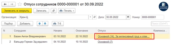 В документе «Отпуск сотрудников (списком)» появилась возможность выбирать несколько отпусков по одному сотруднику в одной строке, что дает возможность в унифицированной формы Т-6а так же выводить их в одну строку.