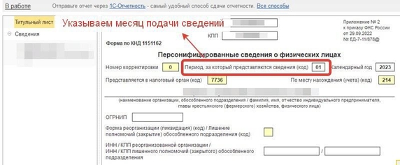 - На титульном листе нужно указать период, за который предоставляются сведения (код): в нашем случае сведения подаются за январь, значит код 01, в феврале будет код 02 и т.д.