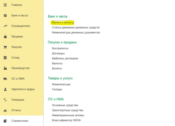 Чтобы операции по ЕНС и уведомления проводились корректно необходимо зайти в раздел Справочники - Налоги и взносы