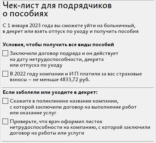 Больничные, пособия по беременности и родам теперь доступны и подрядчикам. (Федеральный закон от 14.07.2022 № 237-ФЗ).