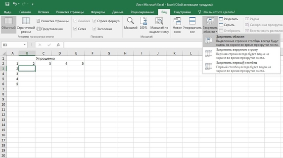 Если вам необходимо закрепить несколько строк и столбцов, например, две верхние строки и первый столбец, выделяем ячейку В3, переходим в «Вид» → «Закрепить области».