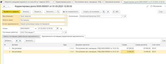 В примере на скриншоте ниже есть дебиторская и кредиторская задолженность по одному и тому же поставщику. Бухгалтер точно знает, что дебиторской задолженности нет.