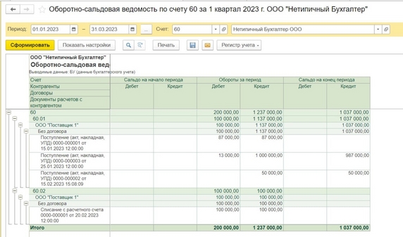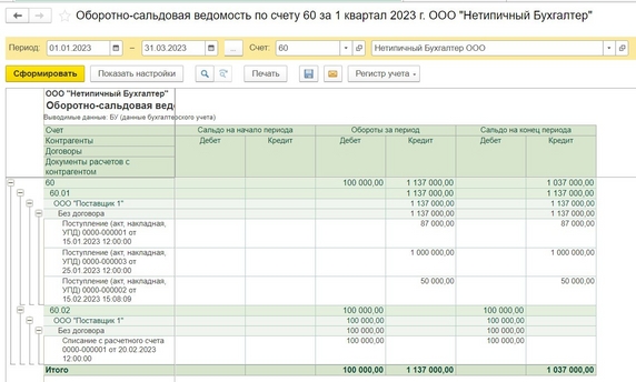 После этого обновить отчет «Оборотно-сальдовая ведомость по счету». В отчете будет видно свернутое сальдо, оно же попадет в бухгалтерскую отчетность.