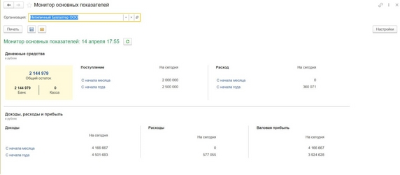Показатели доходов, расходов и прибыли рассчитываются методом начисления, или «по отгрузке», т.е. в доходы попадают суммы реализаций покупателям, а в расходы – начисленная заработная плата, внесенные суммы аренды и других затрат, приобретенные ТМЦ и прочее. Показатели рассчитываются автоматически при открытии «Монитора основных показателей» из раздела «Руководителю».