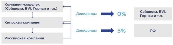 Обратная структура, когда Российская компания владела Кипрской, не пользовалась популярностью, так как российское налоговое законодательство (в отличие от Кипрского) обязывало получателя дивидендов доплатить в бюджет РФ разницу между удержанными на Кипре 5% и домашними 9% или 13% (в зависимости от года).