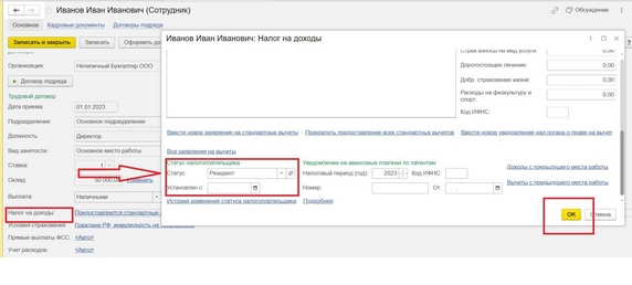 В карточке сотрудника нужно пройти по гиперссылке в поле «Налог на доходы», в открывшемся окне изменить статус налогоплательщика, определить дату, с которой начинает действие новый статус. Сохранить изменения по кнопке Ок.