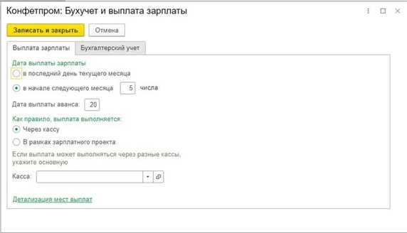 На одной из последних версий программы реализована возможность автоматической выплаты различных частей зарплаты в различные места (например, зарплата – через зарплатный проект, аванс – на карту сотрудника, отпускные – наличными через кассу). Для сотрудника добавлена возможность распределять\ограничивать размеры выплат (например, отпускные 70% на карту и 30% через кассу).