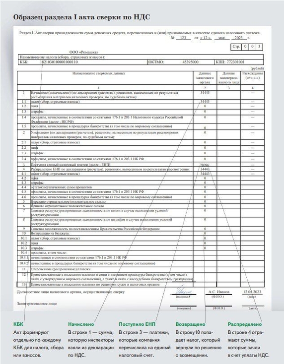 Акт сверки состоит из титульного листа и двух разделов. В раздел I попадают суммы, которые проходили по вашему единому налоговому счету. Раздел II — для сумм, которые не относятся к ЕНП. Например, административные штрафы или некоторые виды госпошлины.