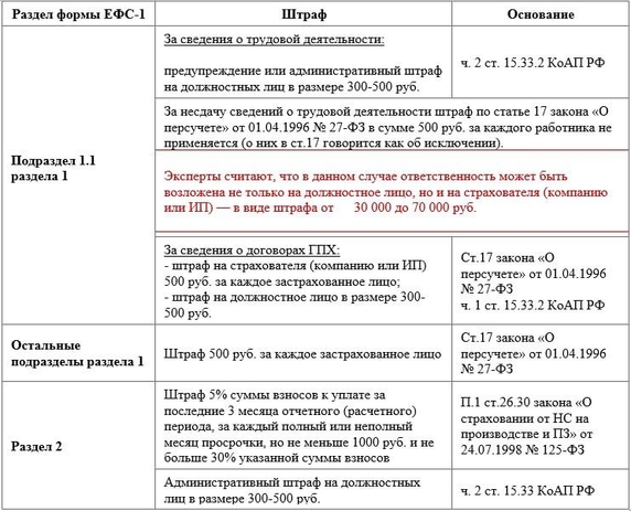Поскольку форма ЕФС-1 по сути набор из нескольких отдельных отчетов, сдаваемых по разным основаниям, то и штрафы за разные части формы тоже налагаются по разным основаниям.