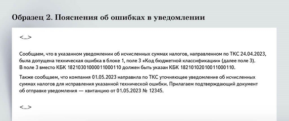 Налоговики настроили свою программу так, чтобы максимально исключить прием уведомлений с ошибками. Например, в КБК или отчетном периоде. Если инспекция сообщила об ошибке в реквизитах, подайте уточняющее уведомление с правильными данными. В ответ на запрос сообщите, что уже отправили исправленный документ. В качестве подтверждения приложите квитанцию о том, что уведомление принято инспекцией. Образец смотрите на картинке.