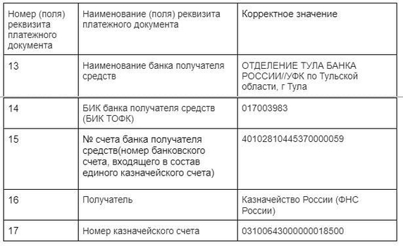 Изменились правила заполнения наименования получателя: теперь в поле 16 необходимо указывать "Казначейство России (ФНС России)". Ранее в этом поле указывали УФК по Тульской области.