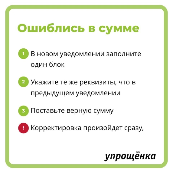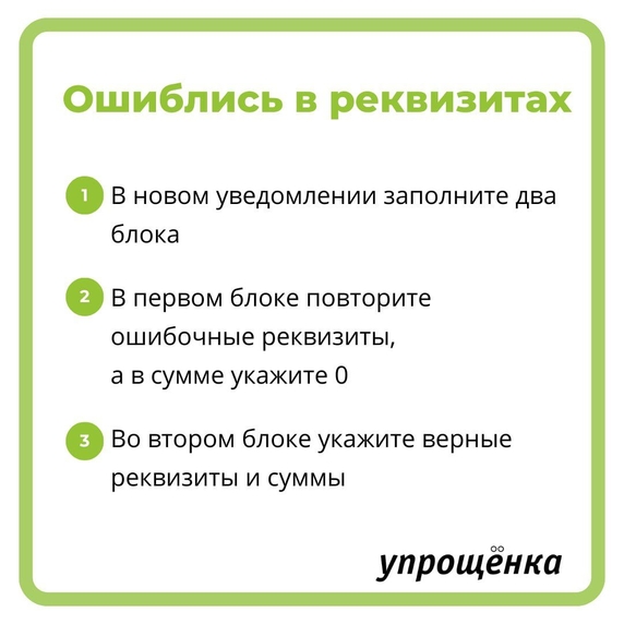 При ошибке в уведомлении вам нужно направить в ИФНС новое уведомление об исчисленном налоге или взносе, в отношении которого ошиблись. Смотрите, в нашей шпаргалке, как заполнить документ в зависимости от того, в чем ошиблись.