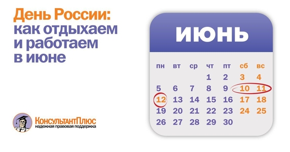 12 июня в этом году выпадает на понедельник. Отдыхать будем 3 дня подряд – с 10 по 12 число. В пятницу 9 июня отпускать сотрудников раньше не нужно, поскольку день не предпраздничный.