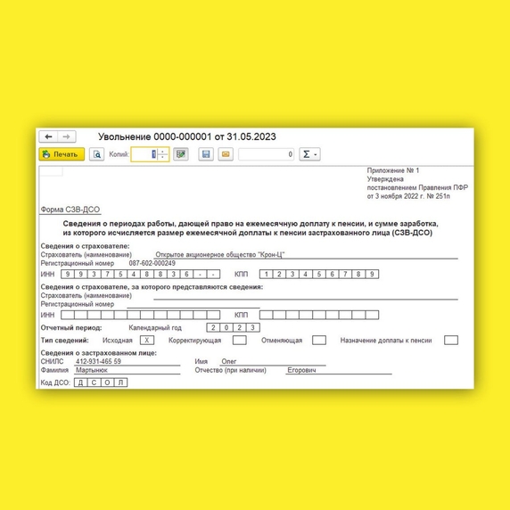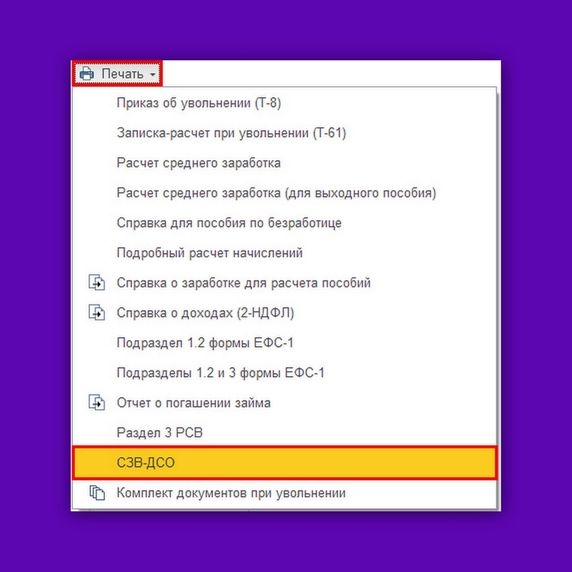 Печать формы СЗВ-ДСО при увольнении в «1С:ЗУП»