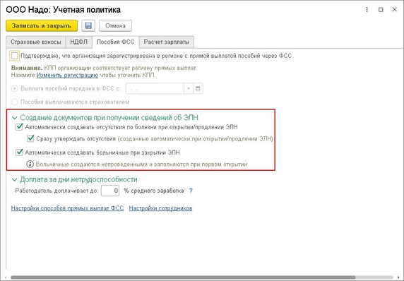 Если решено, автоматически создавать документы отсутствий по болезни (при открытии, продлении ЭЛН) и больничных листов (при закрытии ЭЛН), то в учетной политике организации (раздел Настройки – Организации – ссылка Учетная политика – закладка Пособия ФСС) установите соответствующие флажки (см. картинку).