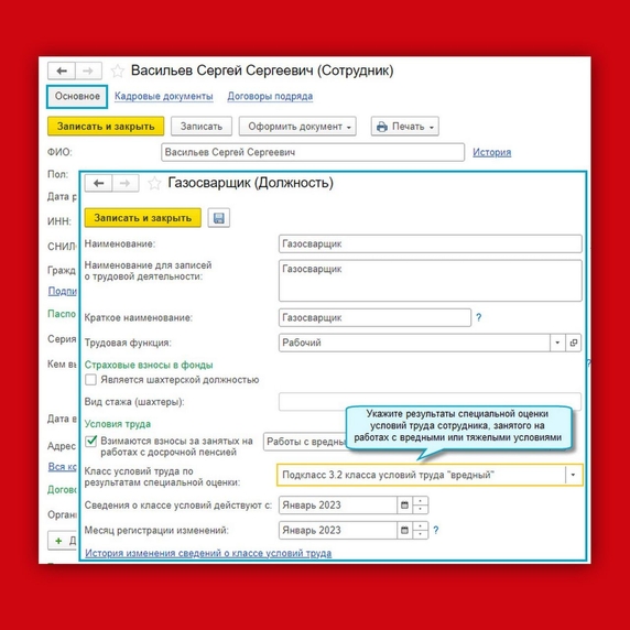 После сохранения сведений по сотруднику при печати формы ЕФС-1 заполняются результаты специальной оценки условий труда в подразделе 1.2 раздела 1.