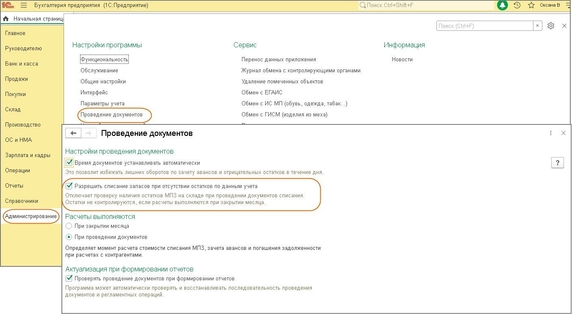 В программе «1С:Бухгалтерия 8» можно отключить контроль остатков при выбытии товаров, материалов и других МПЗ (например, если сведения об остатках запасов еще не введены) (см. картинку). Эта настройка доступна только пользователям с правами «Администратор».