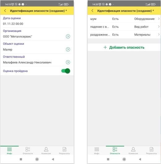 Еще одним важным и трудоемким процессом на предприятии является процесс идентификации опасностей и оценки профессиональных рисков. Невозможно выявить опасности, сидя на рабочем месте за компьютером, для этого необходимо личное присутствие участников комиссии на объекте оценки. И вновь, вооружившись ручкой, специалисты предприятия должны зарегистрировать в своем блокноте все выявленные опасности для формирования перечня. Аналогично процессу проведения проверок, облегчить процесс идентификации опасностей на рабочих местах поможет мобильное приложение, а проанализировать данные и сформировать комплект необходимых документов можно в программе «Охрана труда».