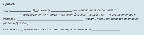 В указанной части необходимо указать реквизиты договора, в рамках которого осуществляется поставка товара, предмет договора и ссылку на пункт договора, приложения к нему, в котором установлены сроки поставки.