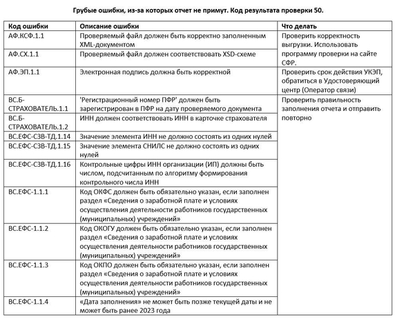 - Код «50» означает, что поданная форма ЕФС-1 не соответствует установленным формам и форматам. Данные ошибки являются ошибками общего характера и не связаны со сведениями о каких-то конкретных застрахованных лицах, указанных в ЕФС-1. Нужно подать сведения заново (приложение 7, утв. постановлением ПФР от 31.10.2022 № 246п).