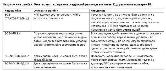- Код «20» означает, что найденные ошибки не считают критическими и СФР взял в обработку сведения, но с предупреждением. Ни исправления, ни уточнения не требуются.