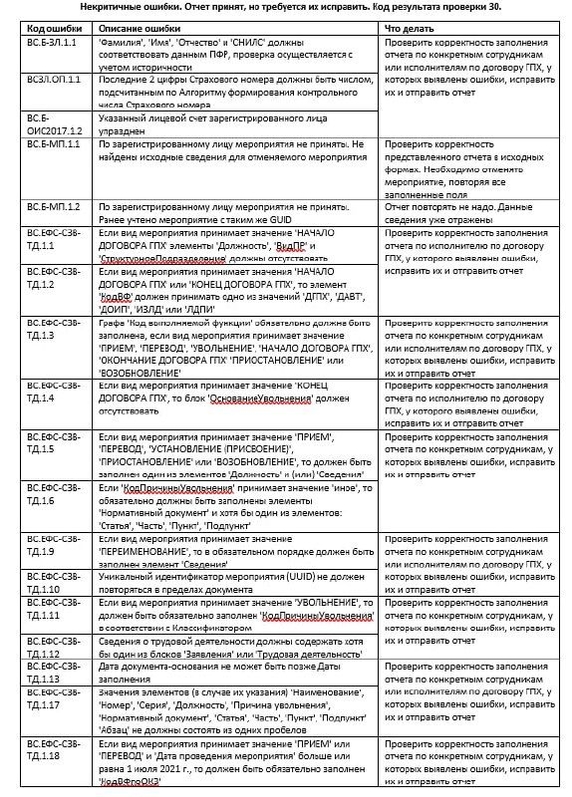 - Код «30» означает, что отчет приняли, но обнаружили незначительные ошибки, которые требуют исправления. Срок для исправления - 5 рабочих дней (ст. 17 Закона от 01.04.1996 № 27-ФЗ).