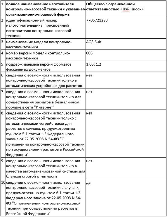Сведения о модели контрольно-кассовой техники «AQSI6-Ф»: