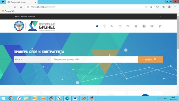 Проверить контрагента можно через сервис ФНС «Проверь себя и контрагента». Для этого нужно ввести ИНН в поле, как указано на скриншоте: