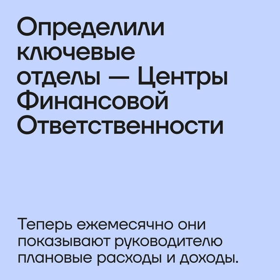 ▪️Определили основные отделы, которые зарабатывают и потребляют деньги: отделы продаж и сопровождения и торговый дом. Их назначили центрами финансовой ответственности (ЦФО). Теперь их руководители отчитываются, планируют доходы и расходы ежемесячно.