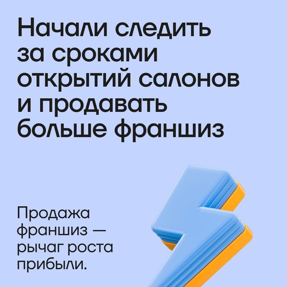 ▪️ Начали следить за сроками открытия салонов. Они часто затягивались на 5 месяцев вместо 2х. Из-за этого компания недополучала прибыль.