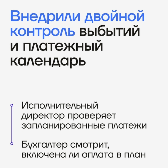 ▪️ Внедрили платежный календарь и двойной контроль за тратами. На первом уровне исполнительный директор проверяет платежи, на втором — бухгалтер.