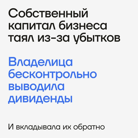 Компания несла убытки из-за больших коммерческих расходов. Оплачивала рекламу и маркетинг для партнеров-франчайзи. Те должны были возмещать затраты, но никто это не контролировал. Соответственно, платили не все. Ситуация ухудшалась, когда собственница бесконтрольно выводила дивиденды. Компания попадала в кассовые разрывы, и владелица вкладывала деньги назад.