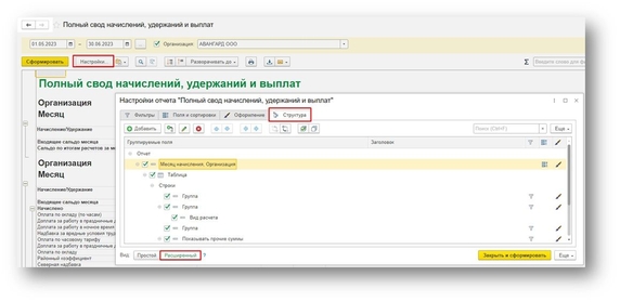Для этого необходимо перейти в расширенные настройки отчёта во вкладку «Структура».