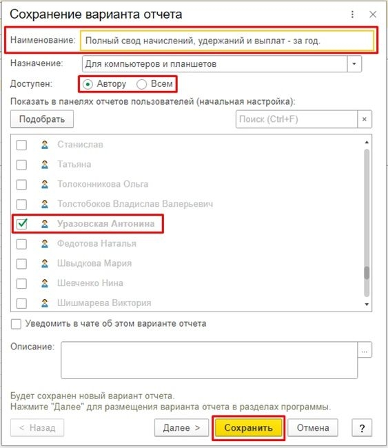 В открывшемся окне можно отредактировать наименование отчёта и выбрать пользователей, для которых он будет доступен.