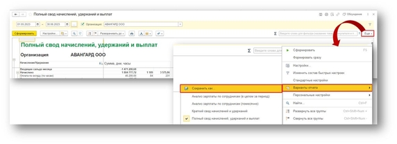 Так же есть возможность сохранить отчёт с данной настройкой, чтобы каждый раз не изменять её. Для этого необходимо перейти по кнопке «Ещё» – «Варианты отчёта» – «Сохранить как…»