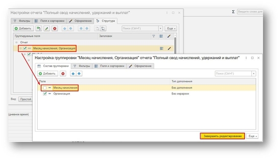 Далее необходимо двумя кликами левой кнопки мыши провалиться в строку «Месяц начисления», «Организация», и убрать флаг рядом со строкой «Месяц начисления».
