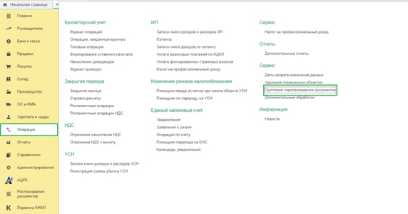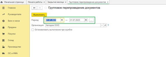 В случае «Группового проведения документов» (через «Операции» - «Сервис» - «Групповое перепроведение документов») перепроводятся все документы и восстанавливается последовательность, в ней задается период перепроведения документов в 1С и возможность остановки при возникновении ошибки.