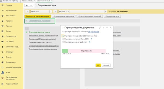 В открытой форме обработки «Закрытия месяца», выполняется только проведение документов, автоматически проверяется актуальность границы последовательности проведения документов.