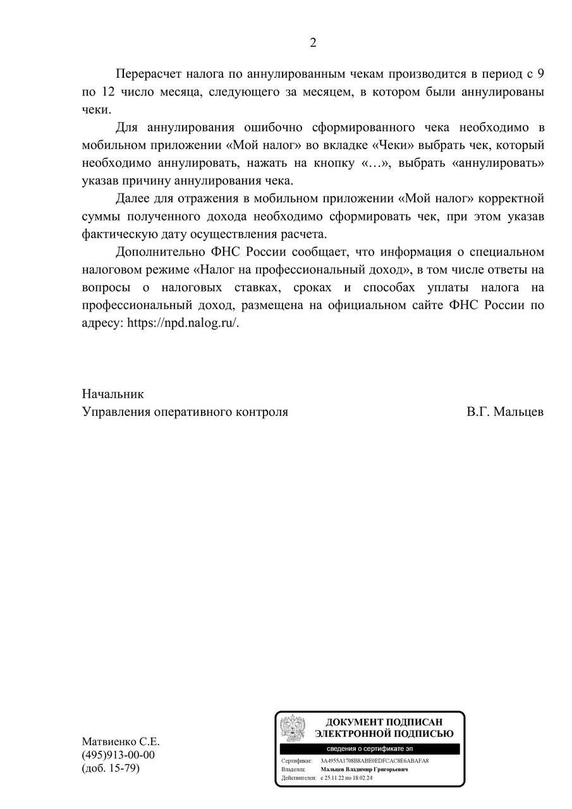 Перерасчет налога по аннулированным чекам производится в период с 9 по 12 число месяца, следующего за месяцем, в котором были аннулированы чеки. Для аннулирования ошибочно сформированного чека необходимо в мобильном приложении «Мой налог» во вкладке «Чеки» выбрать чек, который необходимо аннулировать, нажать на кнопку «…», выбрать «аннулировать» указав причину аннулирования чека. Далее для отражения в мобильном приложении «Мой налог» корректной суммы полученного дохода необходимо сформировать чек, при этом указав фактическую дату осуществления расчета.