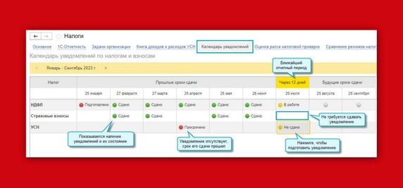 - Простой интерфейс: меню «Налоги — Календарь уведомлений».