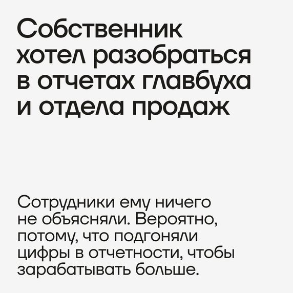 Собственник компании, которая продает и обслуживает сложное промышленное оборудование, обратился к финдиректору НФ. Он хотел разобраться в показателях компании, а именно понять отчеты главбуха и отдела продаж. Сотрудники ничего не объясняли, оказалось, неспроста.